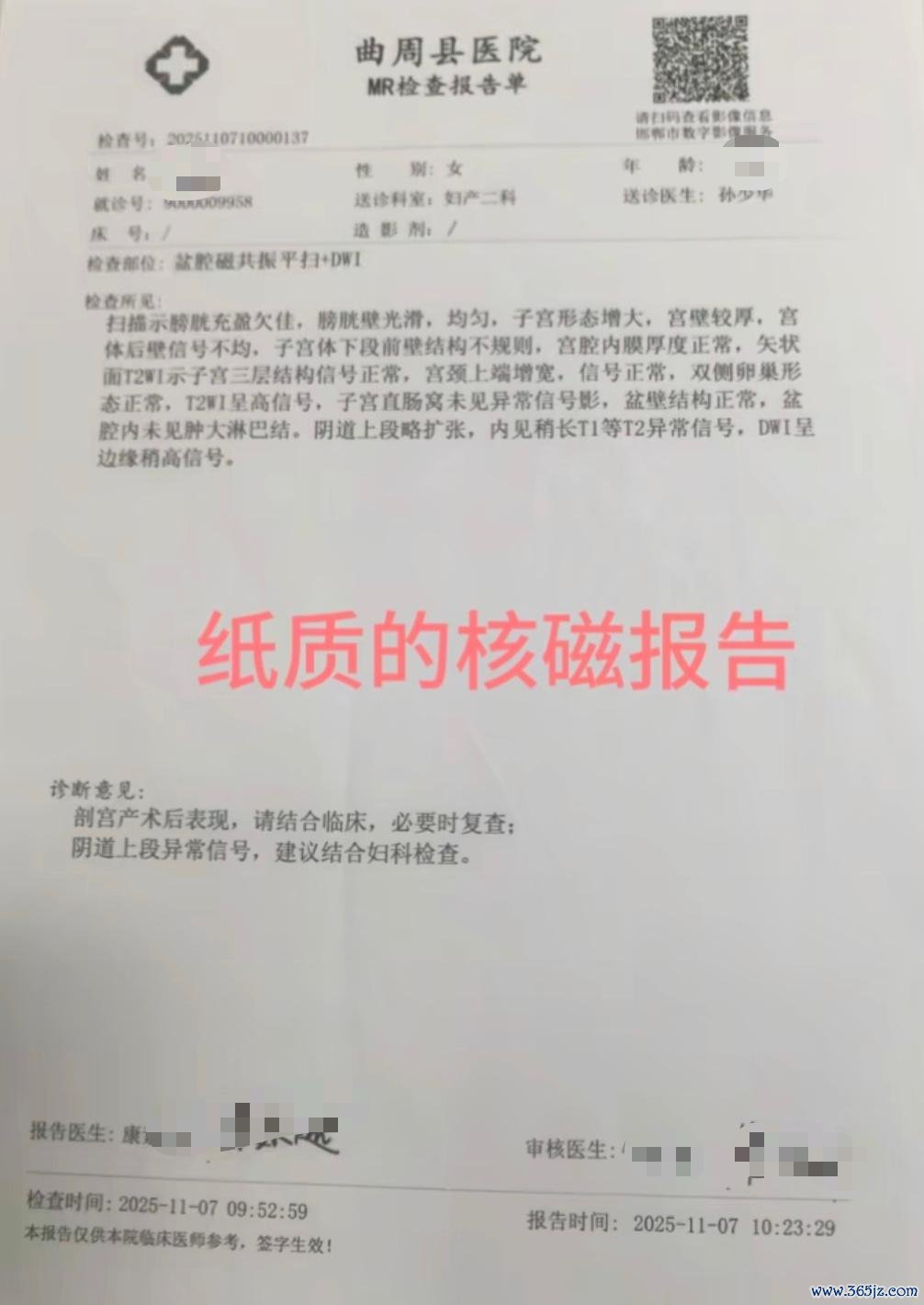 娇娇在曲周县病院作念的盆腔磁共振查验讲演